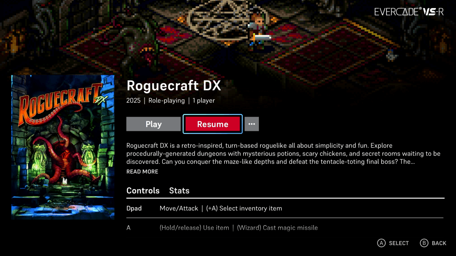 Seit dem Start von Roguecraft DX haben uns jedoch viele Spieler zugehört, die sich eine Art Speichersystem wünschen, mit dem sie ein Spiel halbfertig beenden und später fortsetzen können. Zu diesem Zweck haben wir mit dem Team von Badger Punch Games ein brandneues „Suspend Save“-System für Evercade EXP/EXP-R, VS/VS-R und Alpha entwickelt, das speziell für Roguecraft DX entwickelt wurde. Damit können Spieler mitten im Spiel einen temporären Speicherstand erstellen, das Spiel beenden und zum Evercade-Menü zurückkehren und später dort weitermachen, wo sie aufgehört haben. Der Unterschied zwischen dieser Option und dem Standard-Speicherstatussystem besteht darin, dass dein unterbrochener Speicherstand automatisch gelöscht wird, nachdem du entweder dein laufendes Spiel fortsetzt oder ein neues Spiel startest. Du kannst diese Option also nicht verwenden, um beispielsweise vor dem Kampf gegen ein mächtiges Monster zu speichern und dann neu zu laden, wenn etwas schiefgeht. Komfort ohne Schummeln!