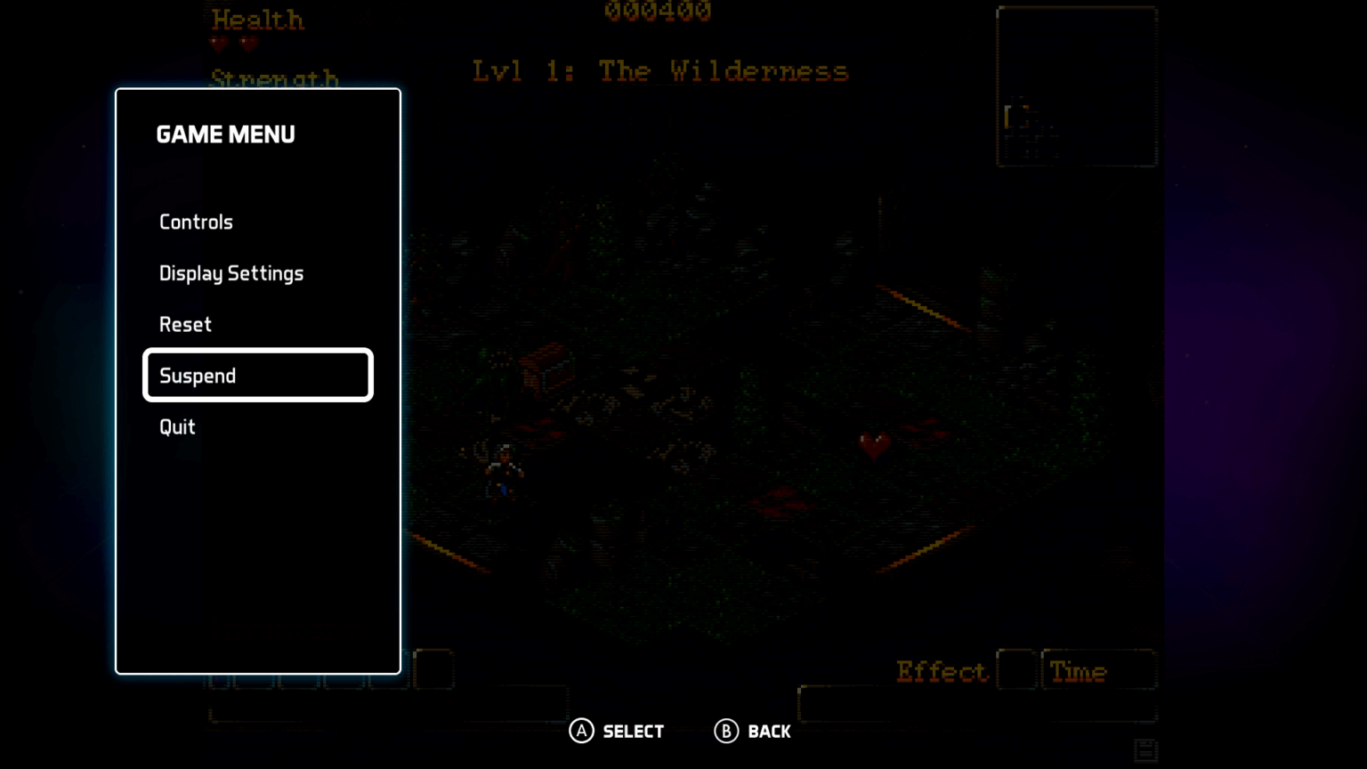 Um eine Roguecraft DX-Sitzung zu unterbrechen, öffne das Evercade-Menü (siehe oben) mit der Menütaste auf deinem Controller und wähle dann „Unterbrechen“. Dadurch wird dein Spiel gespeichert und du kehrst zum Evercade-Hauptmenü zurück.